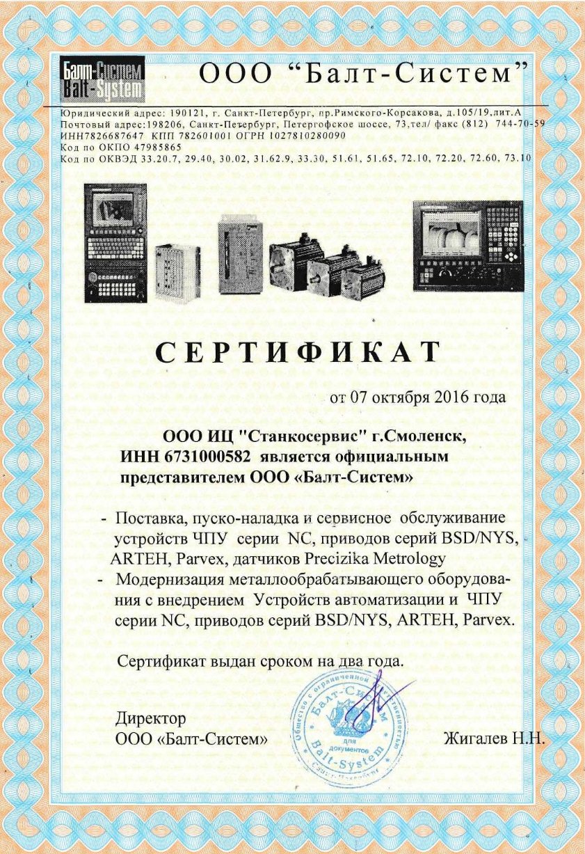 ООО «Эффективное производство» продолжает сотрудничество с компанией "Балт-Систем" по поставке, пуско-наладке и сервисному обслуживанию устройств ЧПУ, приводов и датчиков. Сертификат.